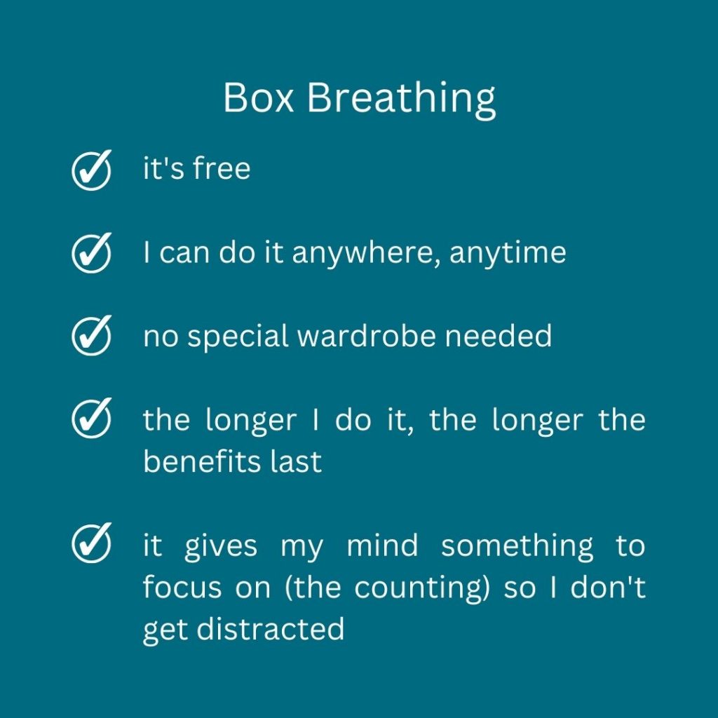 Box breathing in particular was very effective for me when I was going through my year of cancer treatments. It worked to help me fall back to sleep in the middle of the night when the prednisone tried to keep me awake. It calmed my anxiety when the pre-meds drove my mind bonkers. It restored my body’s return to full, deep breathing as I recovered from med-induced pneumonitis. It was one of the most important and consistently effective tools in my toolkit that year.